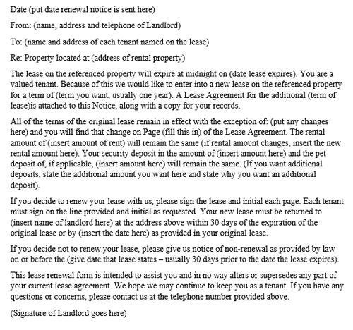 Your current lease expires on {date}. You have been an excellent tenant and have maintained your home in good condition. As such, I would like to offer you a {duration i.e., one-year, six-month} lease renewal at {rent amount/duration}.