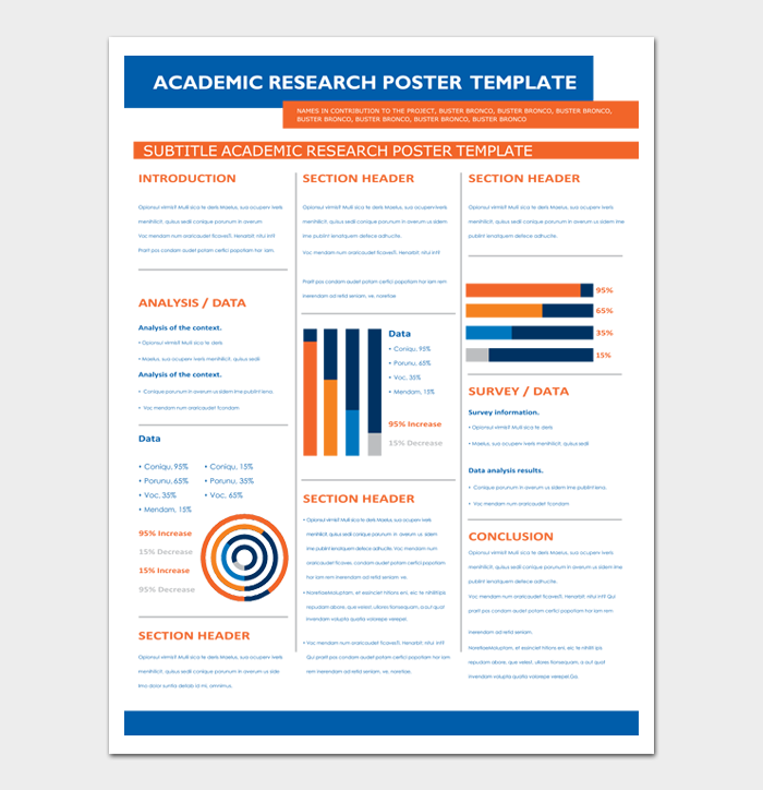 A research poster template is a fillable form that provides the basic outline of a research poster. It may be customized and formatted to suit the needs of the creator. A research poster template simplifies the process of creating a research poster with cues for what information to include and the proper placement of each item.